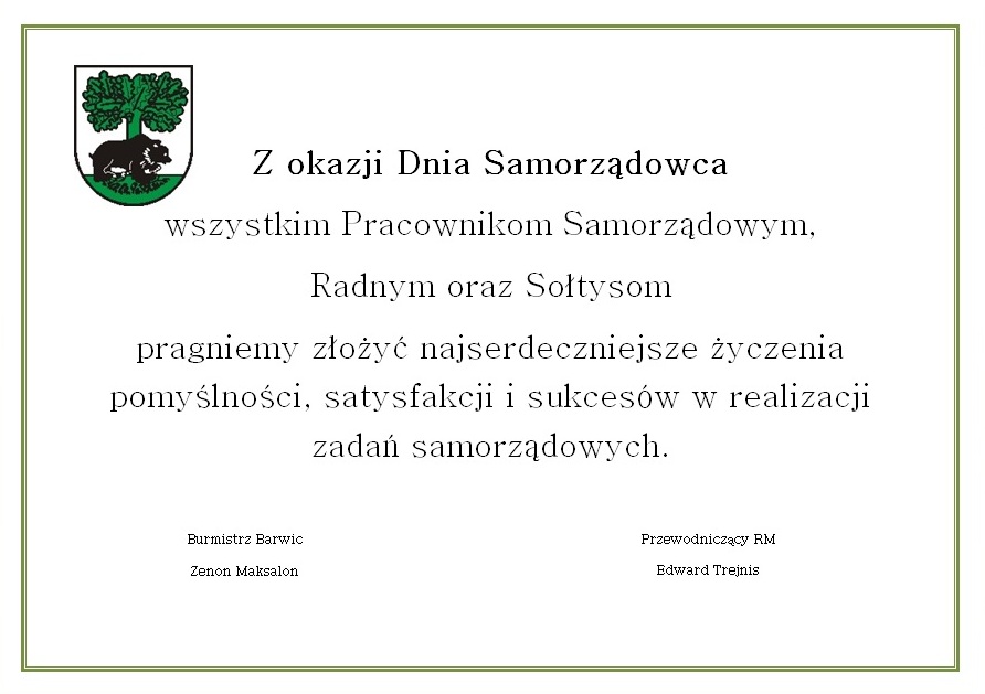 Z okazji Dnia Samorządowca wszystkim Pracownikom Samorządowym, Radnym oraz Sołtysom pragniemy złożyć najserdeczniejsze życzenia pomyślności, satysfakcji i sukcesów w realizacji zadań samorządowych.