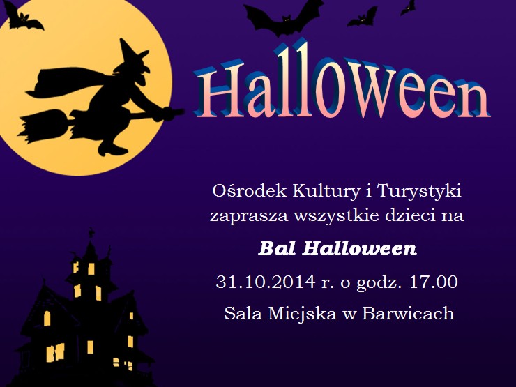 Serdecznie zapraszamy wszystkie dzieci na Bal Halloween, który odbędzie się 31.10.2014 r. o godz. 17.00 w Sali Miejskiej w Barwicach.