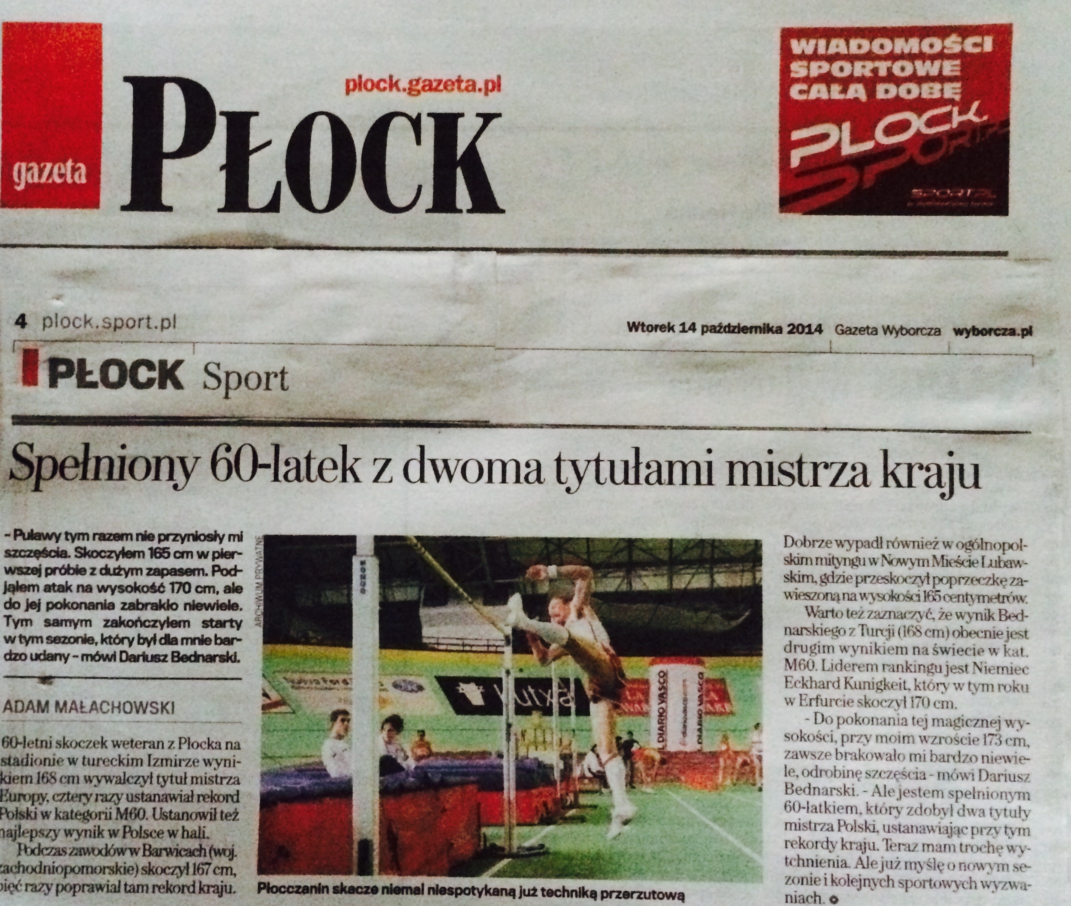 W załączeniu materiał z "Gazety Płockiej" dot. rekordu Polski w kategorii M60 wyskakanego przez Dariusza Bednarskiego w Barwicach.
