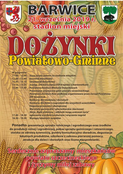 Jest nam niezwykle miło poinformować, że Gmina Barwice wraz ze Starostwem Powiatowym w Szczecinku jest gospodarzem tegorocznych Dożynek Powiatowo - Gminnych, które odbędą się 21 września br. na stadionie miejskim w Barwicach.