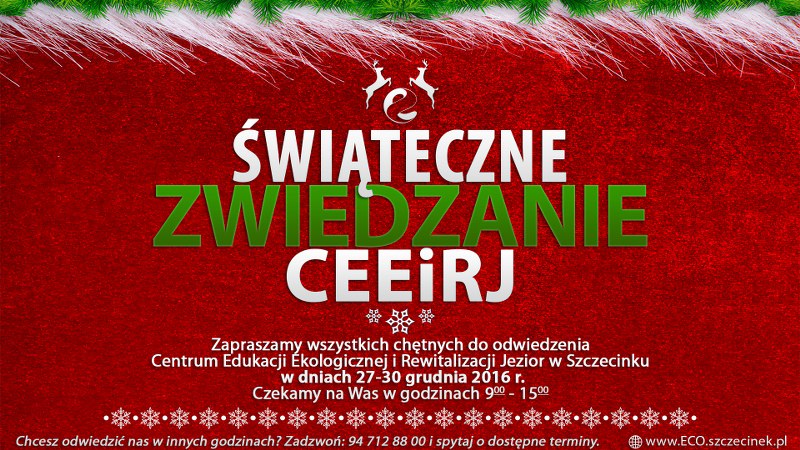 Już za kilka dni rozpocznie się świąteczna przerwa od nauki. Prawdopodobnie wszyscy uczniowie czekali na ten moment już od wielu tygodni. Trudno się im z resztą dziwić. Wizja zbliżającego się odpoczynku, świątecznych prezentów oraz zaplanowanych spotkań z rodziną i przyjaciółmi, to coś, na co warto czekać. Na wszystkich, których kalendarze pękają w szwach oraz tych, którzy nie ułożyli jeszcze planów na ostatnie dni 2016 roku czekać będzie także kadra szczecineckiego Centrum Edukacji Ekologicznej i Rewitalizacji Jezior.
