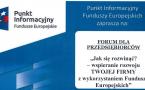 Lokalny Punkt Informacyjny Funduszy Europejskich w Szczecinku serdecznie zaprasza wszystkich Przedsiębiorców na szkolenie pn.: „FORUM dla Przedsiębiorców „ Jak się rozwinąć? – wspieranie rozwoju TWOJEJ FIRMY z wykorzystaniem Funduszy Europejskich”, które odbędzie się 26 czerwca br. w godz. 10:00 – 15:00, w Krono Design Center, ul. Pilska 2, Szczecinek, sala nr 6 (budynek Politechniki Koszalińskiej).
