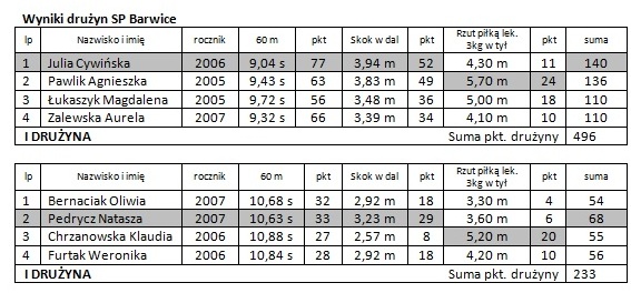 Pierwszą drużynę z SP Barwice reprezentowały: Julia Cywińska V c, Pawlik Agnieszka VI a, Łukaszyk Magdalena V b, Zalewska Aurela IV a. W drugiej drużynie były: Bernaciak Oliwia IV a, Pedrycz Natasza IV b, Chrzanowska Klaudia V c, Furtak Weronika V b. Poza konkursem wystartowała Wiktoria Witkowska