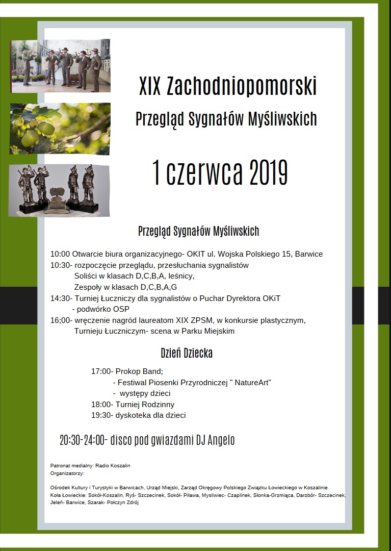 Tegoroczny Zachodniopomorski Przegląd Sygnałów Myśliwskich odbędzie się już w najbliższą sobotę 1 czerwca 2019 r. Wydarzenie rozpocznie się o godz. 10.00 częścią konkursową w OKiT a zakończy je Disco pod Gwiazdami w Parku Miejskim, które potrwa do godz. 24.00. Na mieszkańców i gości czeka wiele atrakcji m.in. przygotowany z okazji Dnia Dziecka Turniej Rodzinny, Festiwal Piosenki Przyrodniczej „NatureArt”, Turniej Łuczniczy oraz dyskoteka dla dzieci.