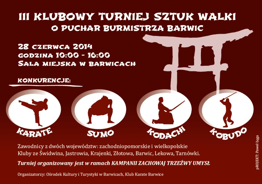 Serdecznie zapraszamy na Klubowy Turniej Sztuk Walki o Puchar Burmistrza Barwic, który odbędzie się 28.06.2014 w godz. 10.00-16.00 w Sali Miejskiej w Barwicach.