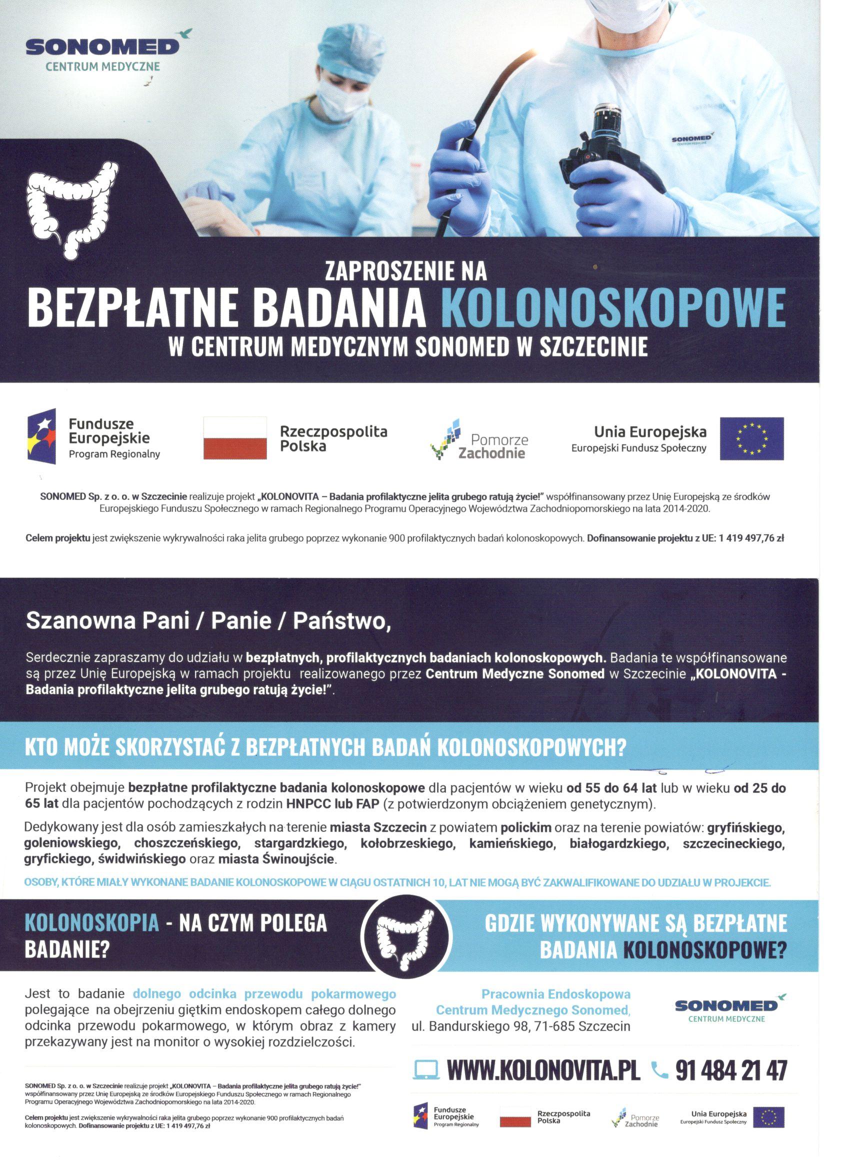 Rak jelita grubego jest jednym z najtrudniej i najpóźniej wykrywanym nowotworem. Najprostszym sposobem jego wykrycia jest kolonoskopia – endoskopowe badanie dolnego odcinka przewodu pokarmowego. Pracownia Endokopowa Centrum Medycznego Sonomed w Szczecinie zaprasza na bezpłatne badania ze znieczuleniem osoby w wieku od 55 do 64 lat lub też w wieku od 25 do 65 lat, jeżeli są obciążone genetycznie. Wszelkie informacje tel: 91 484 21 47.