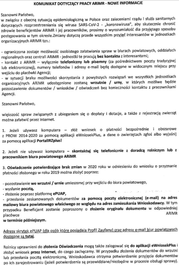 W załączniku przedstawiamy inforamcje dotyczące pracy ARiMR.