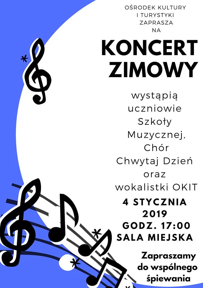 Ośrodek Kultury i Turystyki w Barwicach, Szkoła Muzyki Rozrywkowej, Chór Chwytaj Dzień, Takie nie inne i Okitki zapraszają na KONCERT ZIMOWY. Spotkamy się w piątek 4 stycznia o godzinie 17.00 w sali miejskiej.  Będzie świątecznie i zimowo. Posłuchamy kolęd, piosenek świątecznych w wersjach instrumentalnych jak i wokalnych.  Zapraszamy również do wspólnego śpiewania, bo wiemy że Barwiczanie mają  piękne głosy. Spotkajmy się na popołudniowej herbatce, zwolnijmy na chwilę, bądźmy po prostu razem.