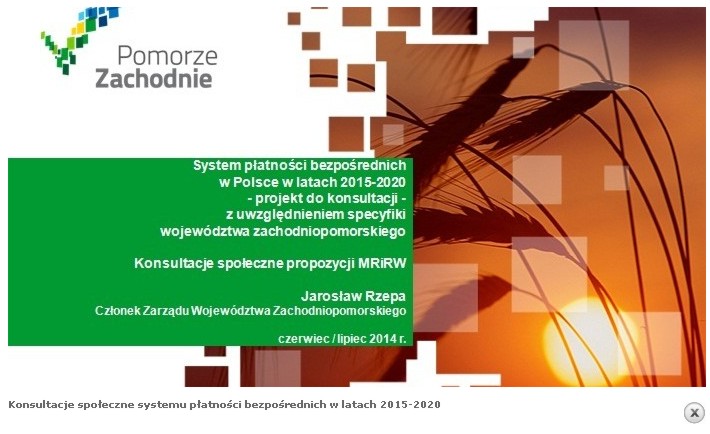 W imieniu Jarosława Rzepy Członka Zarządu Województwa Zachodniopomorskiego zapraszamy wszystkich zainteresowanych na konsultacje społeczne dotyczące systemu płatności dopłat bezpośrednich na lata 2015-2020. Spotkanie odbędzie się 08 lipca b.r. (wtorek) o godz. 17.00 w Zespole Szkół Nr 6 im. S. Staszica Szczecinek-Świątki.