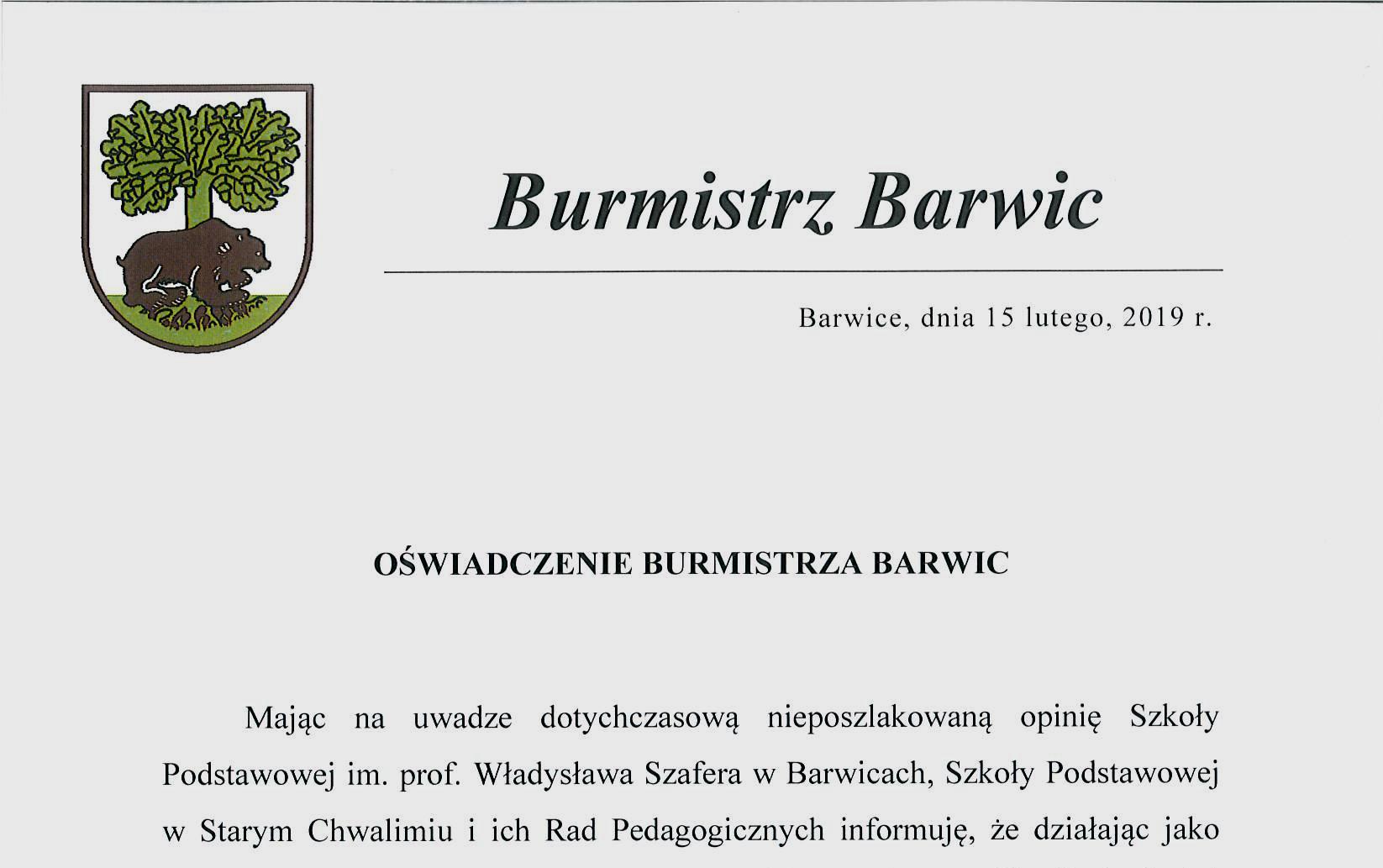 W załączeniu Oświadczenie Burmistrza Barwic w sprawie barwickiej oświaty.