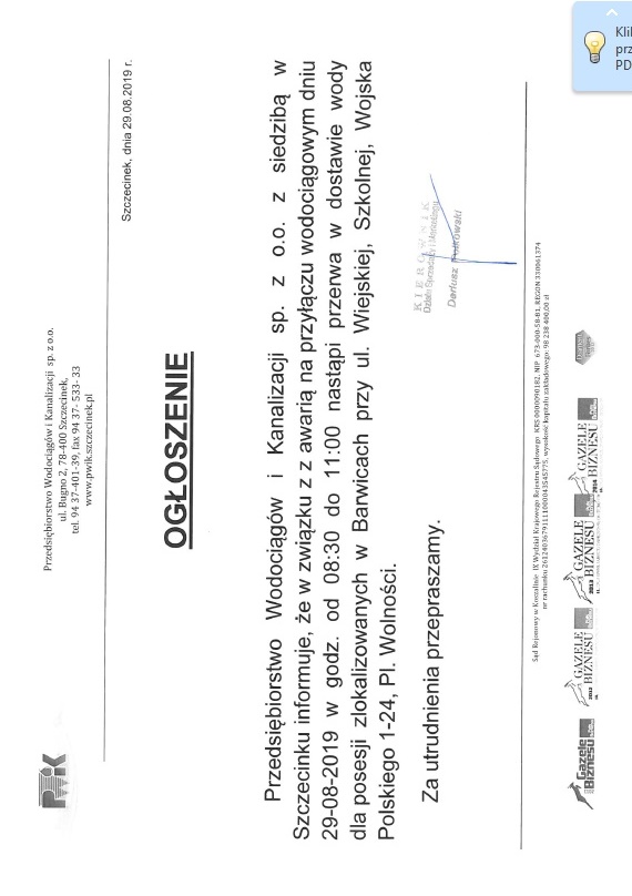 Prosimy o zapoznanie się z załączoną informacją dotyczącą przerwy w dostawie wody.