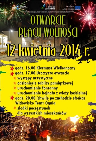 12 kwietnia już o godzinie 17.00 zapraszamy wszystkich mieszkańców naszego miasta na uroczyste otwarcie Placu Wolności po rewitalizacji. W trakcie części oficjalnej nastąpi m.in. uruchomienie fontanny i hejnału na wieży kościelnej. Uroczystość uświetni występ orkiestry dętej i lokalnych grup wokalnych. Natomiast chwilę po zachodzie słońca o godz. 20.00 centrum naszego miasta przemieni się w uliczny teatr ognia w wykonaniu Grupy Lascar ze Szczecina. W trakcie pokazu dla mieszkańców i gości przewidujemy słodkie niespodzianki.