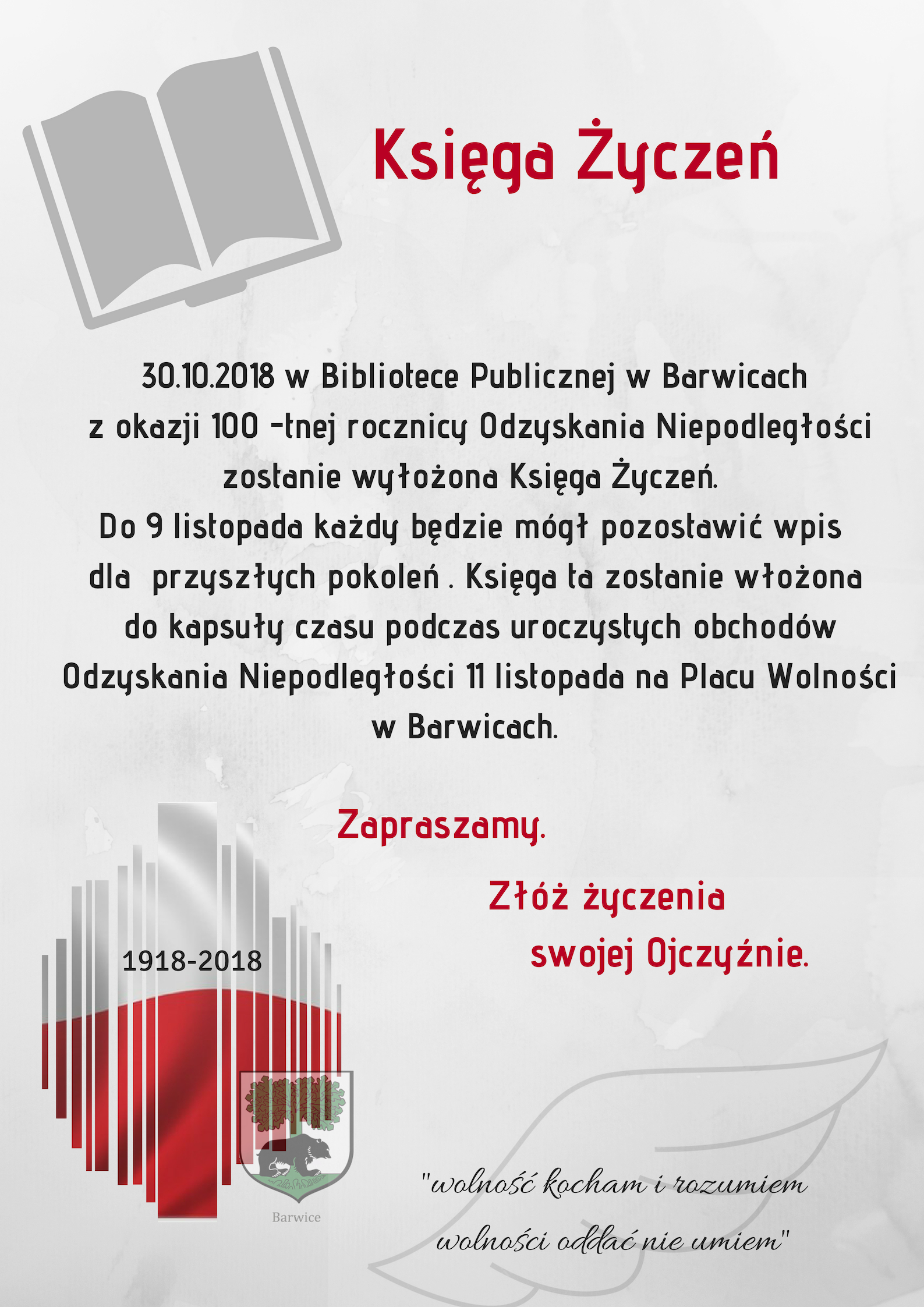Szanowni Państwo, powoli zbliżamy się do obchodów 100-lecia odzyskania Niepodległości przez Polskę. Główne uroczystości odbędą się 11 listopada ale już dzisiaj zachęcamy do zaangażowania się w organizację tego wyjątkowego dnia.