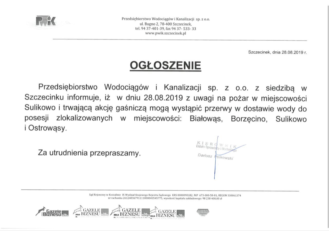 Przedsiębiorstwo Wodociągów i Kanalizacji Sp. z o.o. z siedzibą w Szczecinku informuje, iż w dniu 28.08.2019 roku z uwagi na pożar w miejscowości Sulikowo i trwającą akcją gaśniczą mogą wystąpić przerwy w dostawie wody do posesji zlokalizowanych w miejscowości : Białowąs, Borzęcino, Sulikowo i Ostrowąsy.