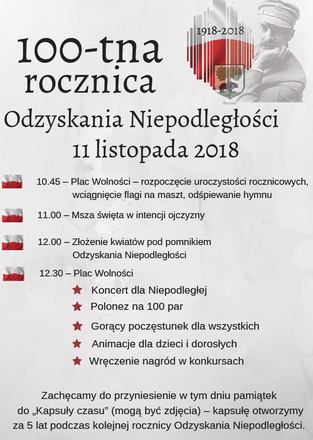 Zachęcamy do przyniesienie w tym dniu pamiątek do „Kapsuły czasu” (mogą być zdjęcia) – kapsułę otworzymy za 5 lat podczas kolejnej rocznicy Odzyskania Niepodległości