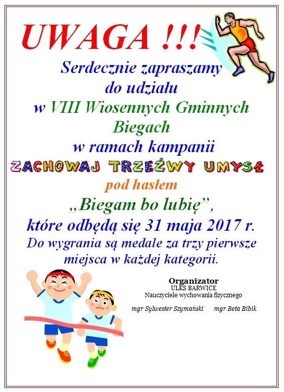 Już 31 maja 2017 r. zapraszamy wszystkich mieszkańców do udziału w VIII Wiosennych Gminnych Biegach z okazji Dnia Dziecka. Celem imprezy jest promocja zdrowego stylu życia poprzez aktywność ruchową w formie biegu, popularyzacja biegów masowych, promocja aktywności ruchowej wśród uczniów naszej szkoły i szkół z terenu gminy.