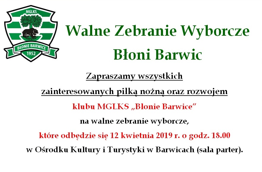 WALNE ZEBRANIE WYBORCZE MGLKS Błoni Barwice odbędzie się 12.04.2019 r. o godz. 18.00 w Ośrodku Klutury i Turystyki w Barwicach