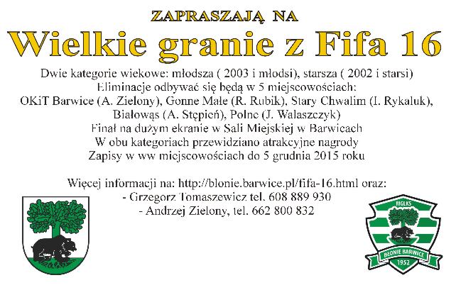 Informacje szczegółowe o grze, uczestnikach a także terminarze gier na stronie: http://blonie.barwice.pl/fifa-16.html oraz: