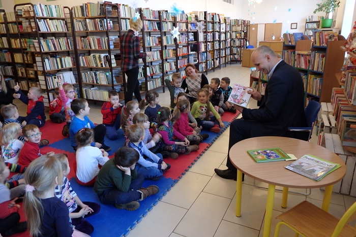 11 stycznia naszą Bibliotekę odwiedziły dzieci z przedszkola. Na początek spotkania dzieci dowiedziały się o pracy w Bibliotece, oraz co należy zrobić aby zostać czytelnikiem. Na nasze spotkanie zaprosiliśmy zastępcę Burmistrza Pana Piotra Sadurę , który z przyjemnością przeczytał dzieciom zabawne wierszyki. Dzieci z wielkim zainteresowaniem słuchały, oraz odpowiadały na zadawane pytania. Każdy uczestnik otrzymał kolorowe naklejki, a najbardziej aktywni słuchacze zostali nagrodzeni nagrodami książkowymi. Dziękujemy Panu Burmistrzowi oraz naszym gościom za miłe spotkanie.