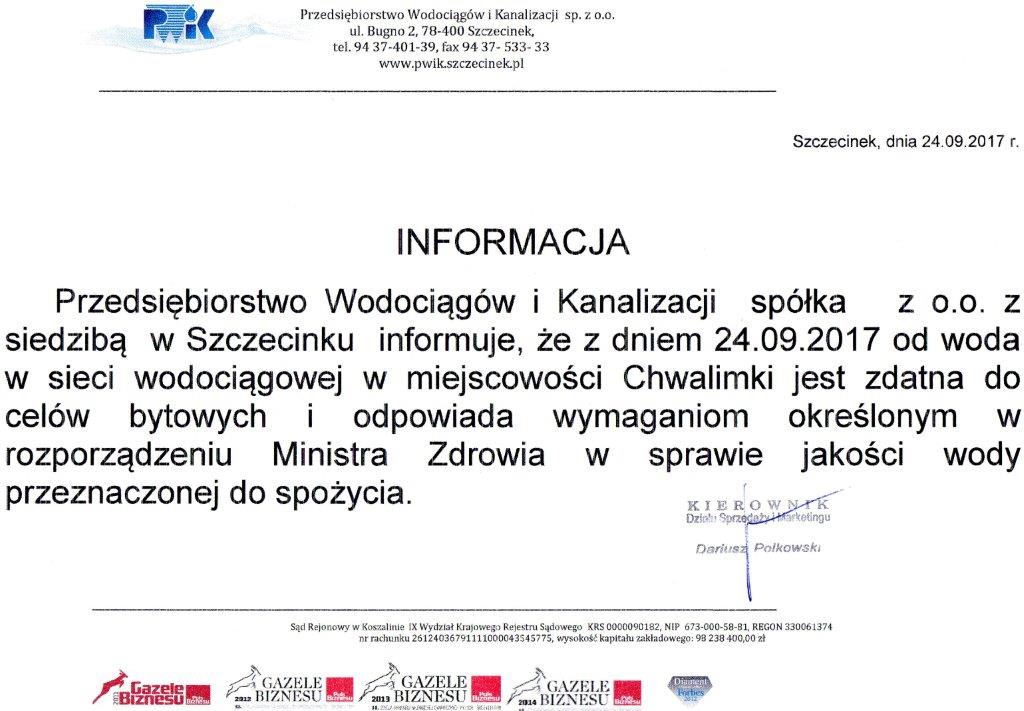Przedsiębiorstwo Wodociągów i Kanalizacji Sp. z o.o. z siedzibą w Szczecinku informuje, że z dniem 24.09.2017 r. woda w sieci wodociągowej w miejscowości Chwalimki jest zdatna do celów bytowych i odpowiada wymaganiom określonym w rozporządzeniu Ministra Zdrowia w sprawie jakości wody przeznaczonej do spożycia.