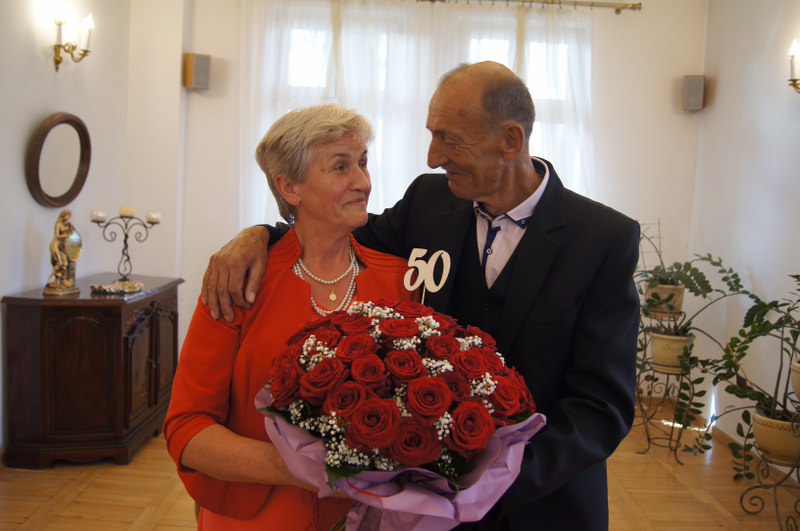 Nasi zacnie goście przybyli do urzędu wraz ze swoimi bliskimi, by uroczyście podziękować sobie za wspólnie przeżyte lata. Przy wspomnieniach pierwszego zauroczenia, dnia samego ślubu i kolejnych lat wspólnego życia był uśmiech, łzy wzruszenia i blask oczu, który pozostał niezmieniony przez te wszystkie lata. Swoim pierwszym w tym dniu tańcem zachęcili nasi jubilaci gości do wspólnego śpiewu i pląsania.