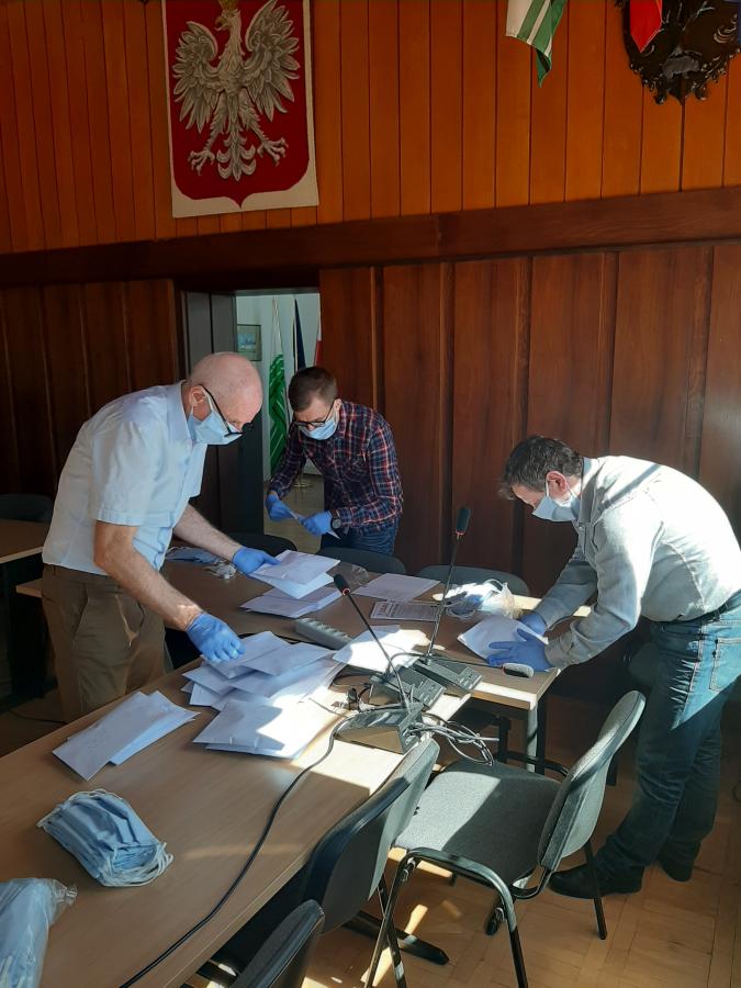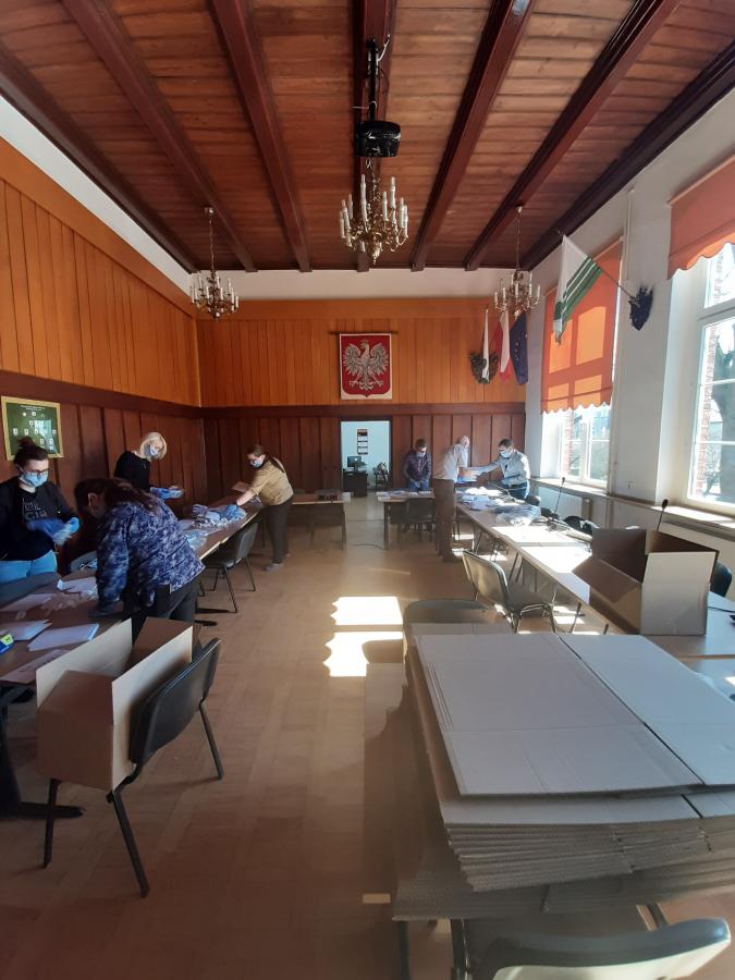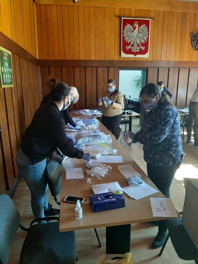 Maseczki dostarczono zgodnie z ilością osób zgłoszonych w systemie gospodarowania odpadami komunalnymi. Pracownicy urzędu przez wiele dni przygotowywali pakiety dla mieszkańców, które były sukcesywnie kolportowane. Maseczki dostarczali: