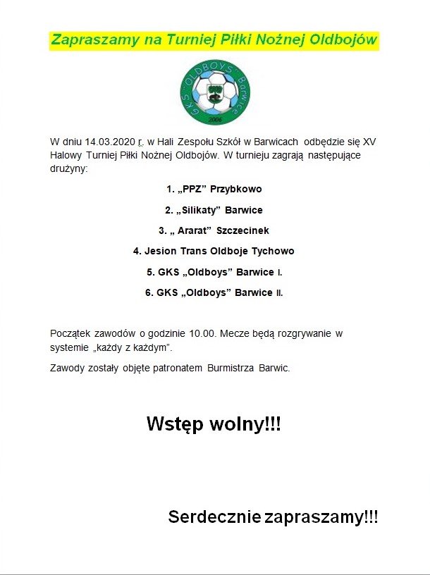 W dniu 14.03.2020 r. w Hali Zespołu Szkół w Barwicach odbędzie się XV Halowy Turniej Piłki Nożnej Oldbojów. W turnieju zagrają następujące drużyny: