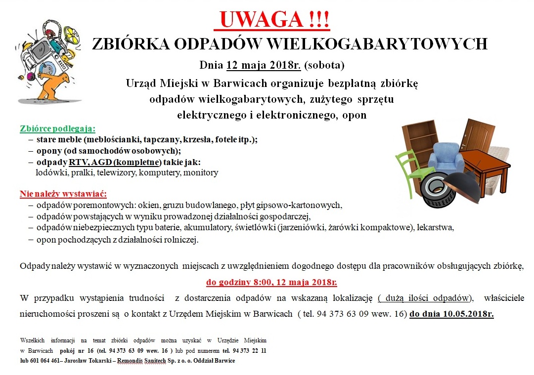 Dnia 12 maja 2018r. (sobota) Urząd Miejski w Barwicach organizuje bezpłatną zbiórkę odpadów wielkogabarytowych, zużytego sprzętu elektrycznego i elektronicznego, opon.