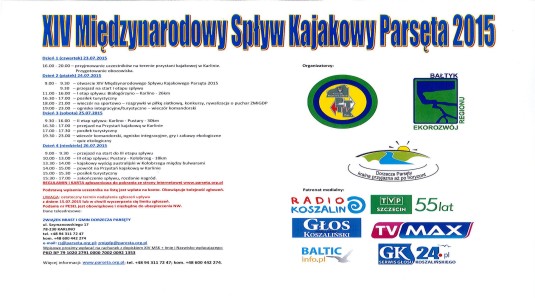 Związek Miast i Gmin Dorzecza Parsęty w Karlinie serdecznie zaprasza do uczestnictwa w „XIV Międzynarodowym Spływie Kajakowym Parsęta 2015. Europejskie Spotkania Ekologiczne”. Tegoroczna edycja odbędzie się w dniach 23-26 lipiec 2015. Wzorem lat ubiegłych, uczestnicy wezmą udział w akcji sprzątania rzek Radew i Parsęta, po których wyznaczone są szlaki kajakowe. Za zebranie największej ilości pływających odpadów, przewidziano bardzo atrakcyjne nagrody. Dodatkowymi atrakcjami będą zawody kajakowe i bardzo widowiskowy, „Wyścig Australijski”, który rozegrany zostanie 26 lipca (niedziela) pomiędzy 1200 a 1300 na Bulwarze nad Parsęta w Kołobrzegu o puchar Przewodniczącego Związku oraz cenne nagrody rzeczowe, ufundowane przez sponsorów.