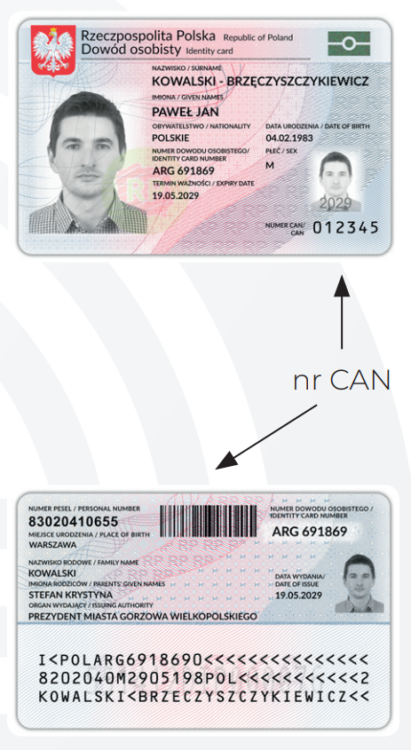 Użycie funkcjonalności elektronicznych dowodu osobistego będzie wymagało przyłożenia dokumentu do czytnika i wpisania numeru identyfikacyjnego CAN zamieszczonego w dowodzie osobistym w postaci cyfrowej i kodu kreskowego lub odczytania numeru CAN przy pomocy czytnika kodu kreskowego. Wiarygodność nawiązania komunikacji potwierdzana będzie każdorazowo numerem identyfikacyjnym CAN, co uniemożliwi nieautoryzowane odczytanie danych.