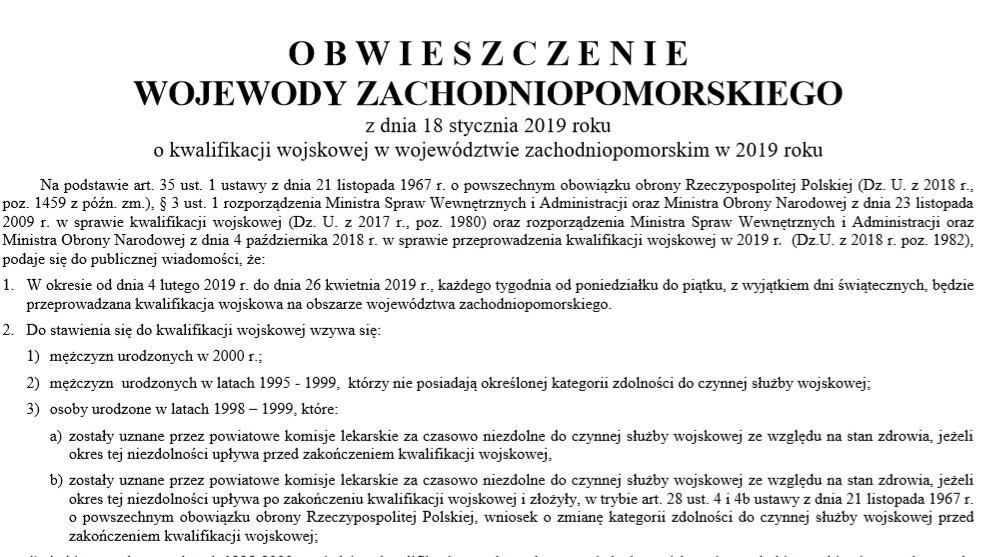 Kwalifikacja wojskowa dla osób zamieszkałych na terenie Powiatu Szczecineckiego zostanie przeprowadzona w okresie od 4 lutego do 1 marca 2019 r., od poniedziałku do piątku, z wyjątkiem dni świątecznych.