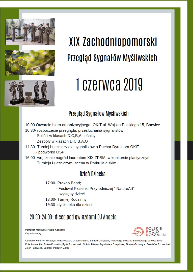 Tegoroczny Zachodniopomorski Przegląd Sygnałów Myśliwskich odbędzie się już w najbliższą sobotę 1 czerwca 2019 r. Wydarzenie rozpocznie się o godz. 10.00 częścią konkursową w OKiT a zakończy je Disco pod Gwiazdami w Parku Miejskim, które potrwa do godz. 24.00. Na mieszkańców i gości czeka wiele atrakcji m.in. przygotowany z okazji Dnia Dziecka Turniej Rodzinny, Festiwal Piosenki Przyrodniczej „NatureArt”, Turniej Łuczniczy oraz dyskoteka dla dzieci.
