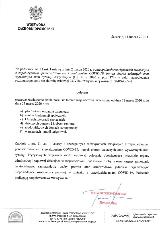 11 marca, w godzinach wieczornych Wojewoda Zachodniopomorski Tomasz Hinc polecił zawiesić w całym regionie działalność: placówek wsparcia dziennego, centrów i klubów integracji społecznej, dziennych domów i klubów seniora i środowiskowych domów samopomocy, warsztatów terapii zajęciowej. Ma to na celu zapobieganie rozprzestrzeniania się koronawirusa.