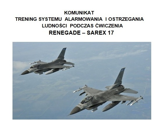 Uprzejmie informuję , że w dniach 6 – 8 czerwca 2017 r. Dowództwo Operacyjne Rodzajów Sił Zbrojnych RP organizuje ćwiczenie RENEGADE – SAREX 17. Elementami przedsięwzięcia w trybie całodobowym są epizody dotyczące naruszenia przestrzeni powietrznej Rzeczypospolitej Polskiej przez statek powietrzny o statusie RENEGADE, stwarzający potencjalne zagrożenie dla ludności cywilnej.