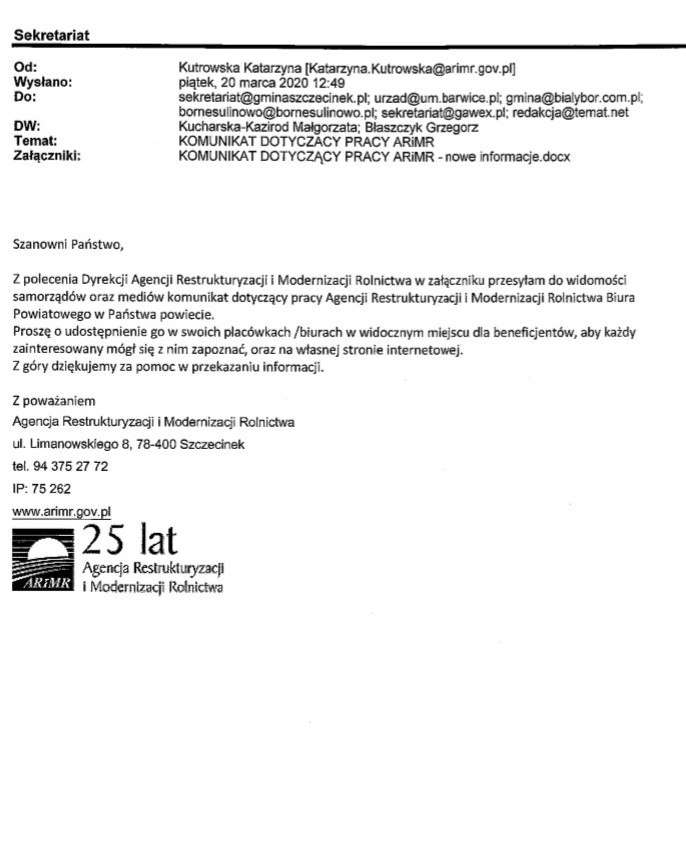 W załączniku przedstawiamy inforamcje dotyczące pracy ARiMR.