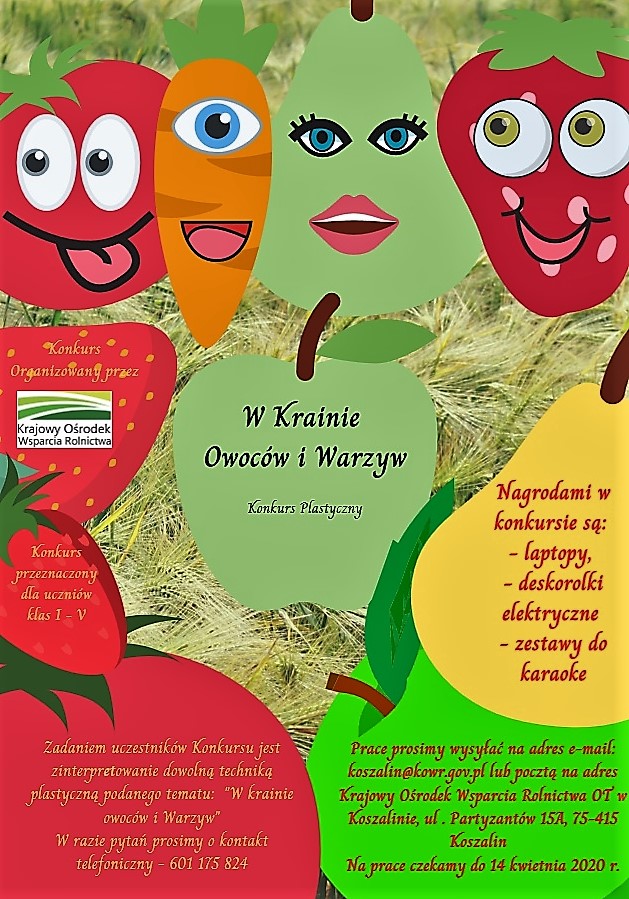 W związku z kwarantanną, dzieci dysponują dużą ilością wolnego czasu. Dlatego też chcielibyśmy zachęcić je do wzięcia udziału w konkursie plastycznym pn. „ W Krainie Owoców i Warzyw". Konkurs kierowany jest do dzieci klas I-V z podziałem na kategorie wiekowe tj. 1 kategoria I-III kasa, 2 kategoria IV-V klasa. Zadaniem uczestników Konkursu jest zinterpretowanie dowolną techniką plastyczną (rysunek, malarstwo, kolaż, techniki mieszane) podanego tematu : „W Krainie owoców i warzyw". Preferujemy prace nadesłane drogą mailową aby zminimalizować potrzebę wyjścia z domu. Termin dostarczenia prac upływa 14.04.2020 r. Na zwycięzców czekają cenne nagrody, tj. laptopy, deskorolki elektryczne, zestawy do karaoke.