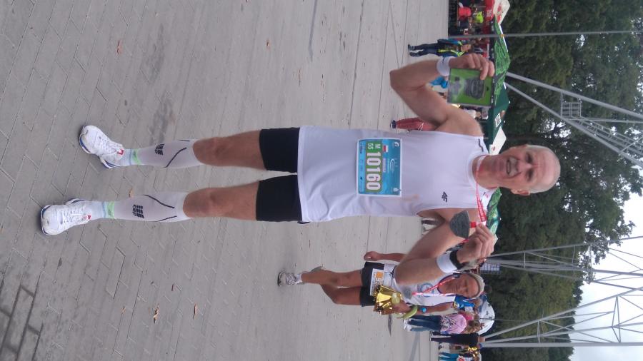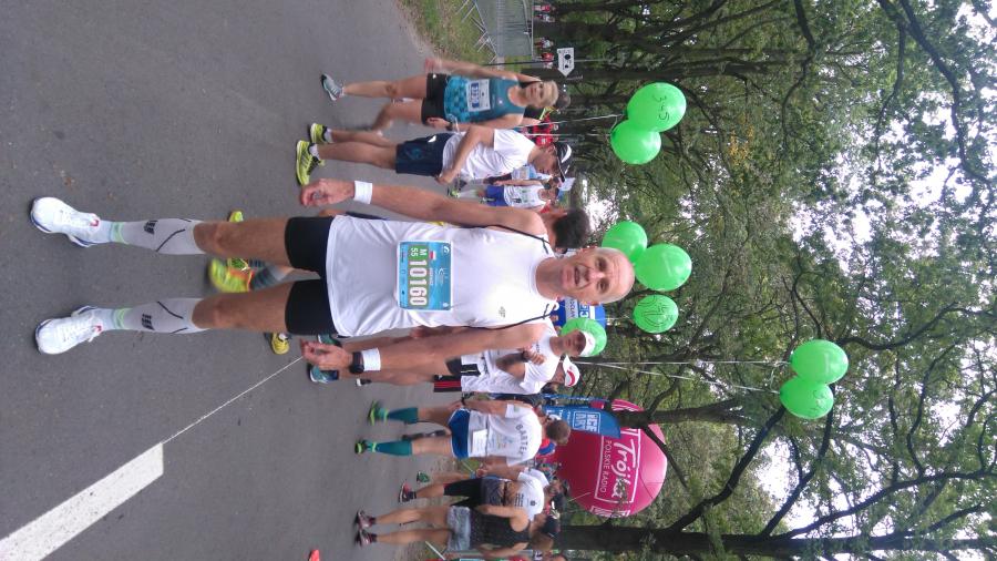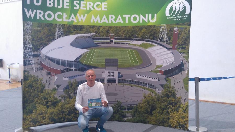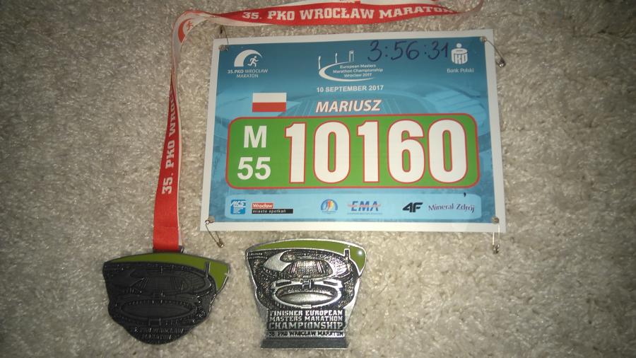 10 wrzesień 2017 r. Wrocław - 35 PKO Wrocław Maraton, to czas i miejsce spełnienia życiowego sportowego celu. Decyzja podparta dodatkowo udziałem w Mistrzostwach Europy Weteranów, które odbywały się w ramach wrocławskiego maratonu. Na starcie stanęło ponad 5,5 tyś. biegaczy z Europy i Świata (min. Kenijczycy), a ukończyło 4,6 tyś. Maraton to nie tylko przebiegnięcie 42 kilometrów, to również walka z psychiką oraz swoimi słabościami. Maraton to przede wszystkim walka z kryzysami, które są nie do uniknięcia. Również i ja tego doświadczyłem, będąc na 38 km. o krok podjęcia decyzji przerwania biegu. W środowisku maratończyków – amatorów panuje zasada, że czas przebiegnięcia maratonu nie ma większego znaczenia. Sama decyzja ustawienia się na starcie maratonu jest wielką odwagą, wartością. Mój pierwszy, a zarazem ostatni maraton dobiegł końca. Takie były postanowienia. Czas 3 godz. 56 min. oraz26 miejsce w Mistrzostwach Europy Weteranów w kategorii M-55 bardzo mnie satysfakcjonuje. Spełnione zostały marzenia, choć droga ich realizacji była trudna, ale przepojona wieloma pięknymi chwilami. Teraz czas na mały wypoczynek i kolejne sportowe wyzwania.