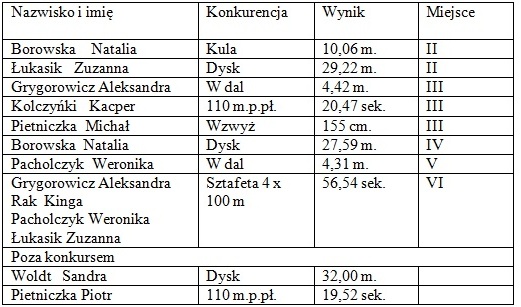 Brązowe medale zdobyli: Aleksandra Grygorowicz w skoku w dal 4,42 m., Kacper Kolczyński w biegu na 110 metrów przez płotki 20,47 sek. oraz Michał Pietniczka w skoku wzwyż 155 cm.
