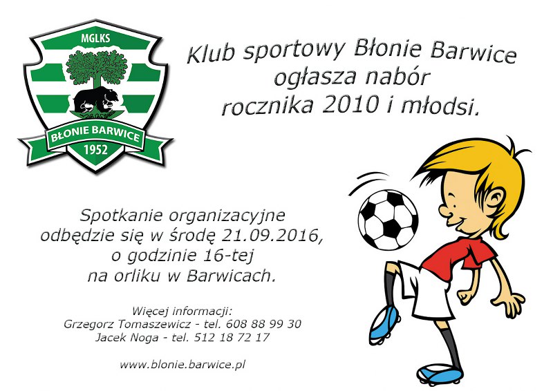 Klub sportowy Błonie ogłasza nabór do rocznika 2010 i młodsi. Zgłaszać się mogą zarówno chłopcy jak i dziewczęta.
