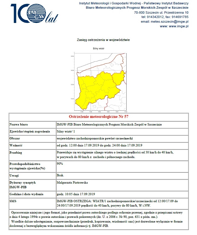 Biuro Meteorologicznych Prognoz Morskich w Szczecinie ostrzega przed silnymi wiatrami.