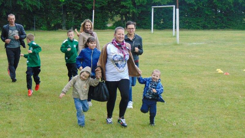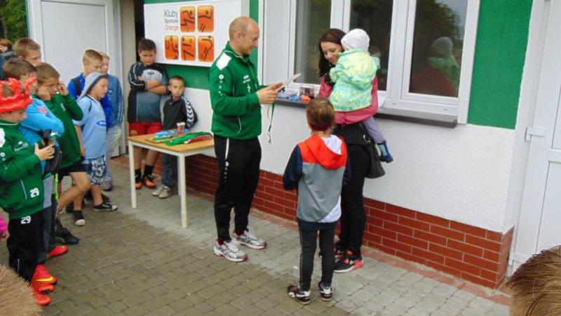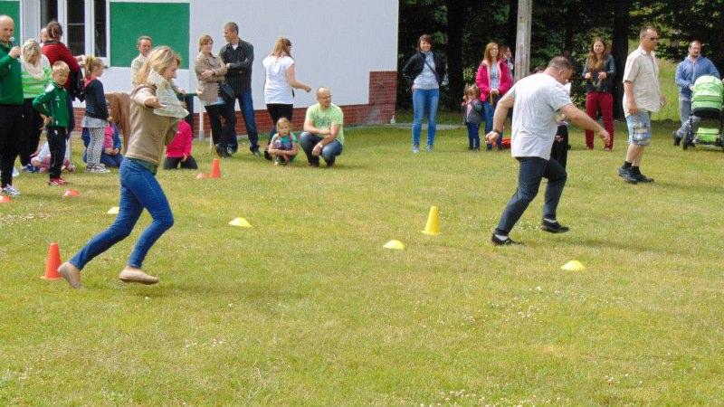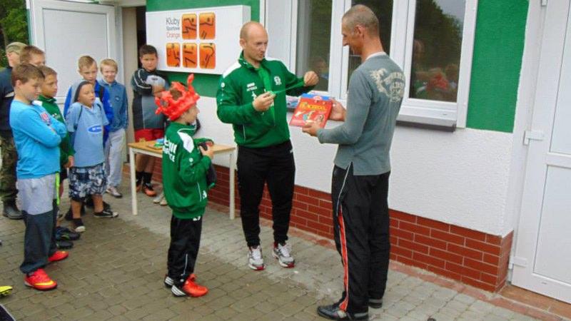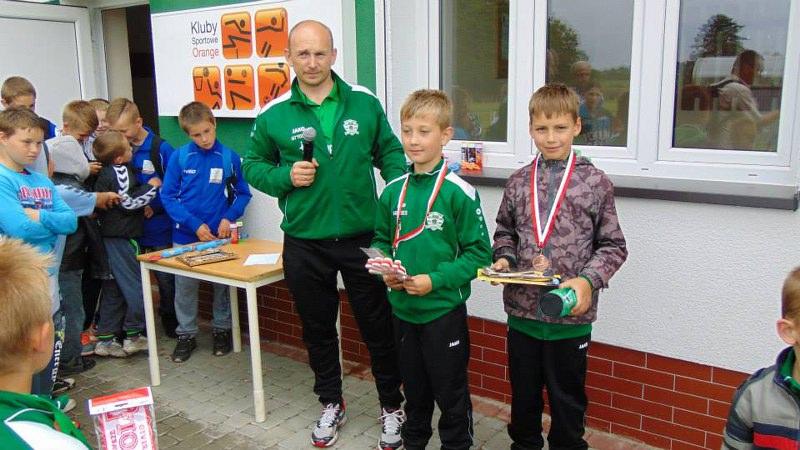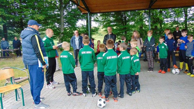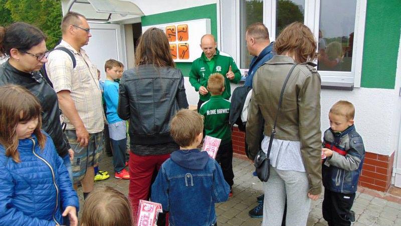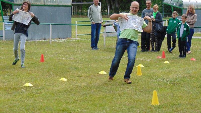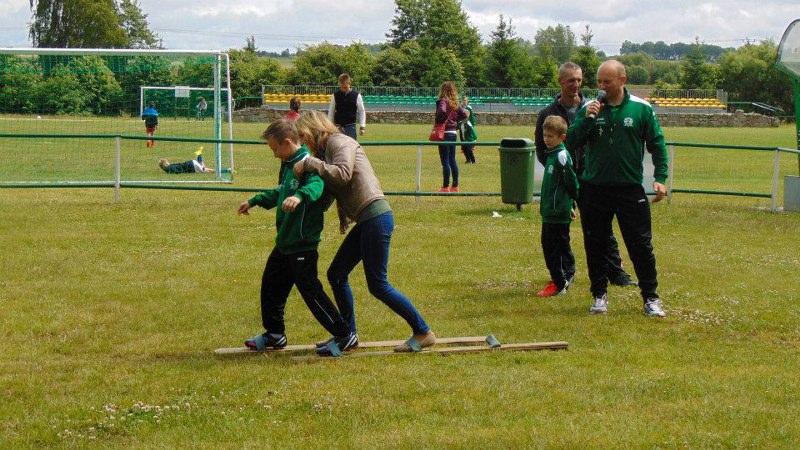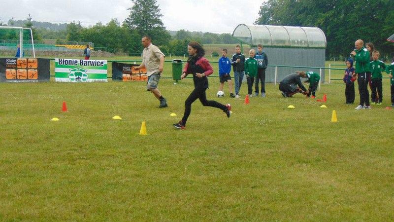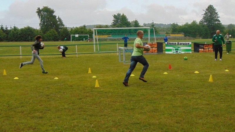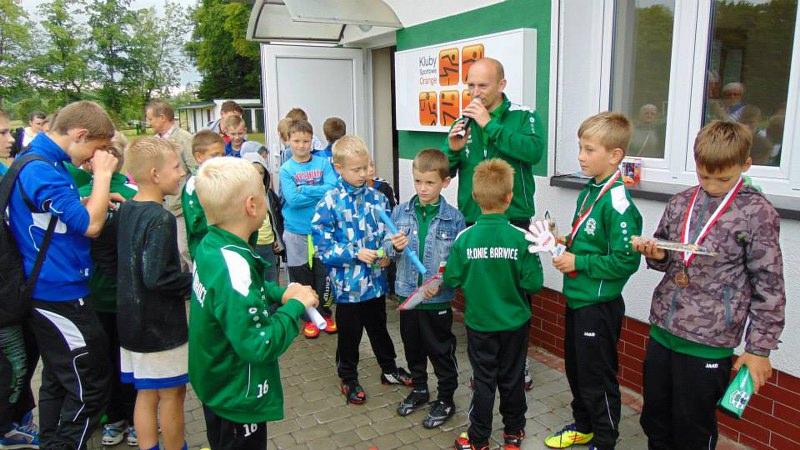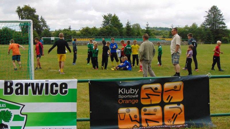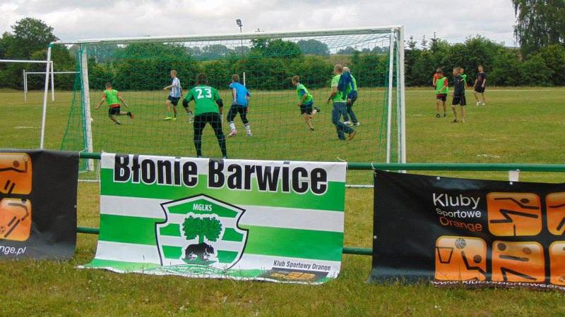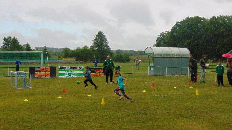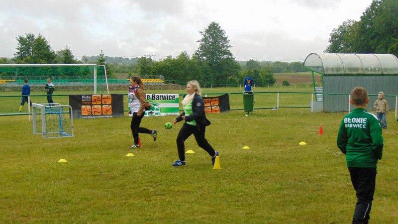 Ze względu na padający deszcz nie zostały rozłożone zamki dmuchane ( względy bezpieczeństwa). Udało się jedynie pod wiatą rozłożyć mały zamek do skakania. Rodzice i zawodnicy z cukru nie byli i mimo deszczyku bardzo chętnie brali udział w różnych konkurencjach sportowych przygotowanych przez trenerów Jacka Nogę i Grzegorza Tomaszewicza. Było bardzo dużo dobrej zabawy. Po wprowadzeniu - grze ożywiającej na początek rodzice konkurowali w wyścigach rzędów, na nartach dwu i trzy osobowych, wyścigu z gazetą na piersi ( przy dużej prędkości gazeta nie spadała) i slalom po piłki, która z drużyn przyniosła najszybciej wszystkie piłki na metę. W ramach Klubów Sportowych Orange odbył się również wyścig rodzinny. Aby można było wziąć w nim udział, rodzic musiał biec w parze z dzieckiem. Rozegrany został mecz zawodników wraz z rodzicami, konkurs dwójek, strzały w poprzeczkę, słupek i konkurs rzutów karnych. Dzięki uprzejmości i organizacji Andrzeja Zielonego można było wziąć udział w konkursach strzałów z wiatrówki. Pod wiatą cały czas dostępne były kiełbaski z grilla oraz kawa, herbata i ciasta upieczone przez rodziców. Na koniec uczestnicy otrzymali upominki ufundowane przez Klub Błonie Barwic oraz Urząd Miejski w Barwicach. Mamy nadzieję, że spędziliśmy wszyscy miło ten czas. Pogoda trochę nie dopisała i nie ze wszystkich przygotowanych atrakcji mogliśmy skorzystać, ale cieszymy się, że mimo wszystko rodzice bardzo chętnie brali udział w konkursach. Serdecznie dziękujemy za miłą zabawę, pomoc w organizacji a także cały sezon piłkarski. Podziękowanie również dla trenerów klubu Błonie Barwice oraz Ryśka Chojnackiego, Bogdana Jabłońskiego i gospodarza Rafała Zielenkiewicza.