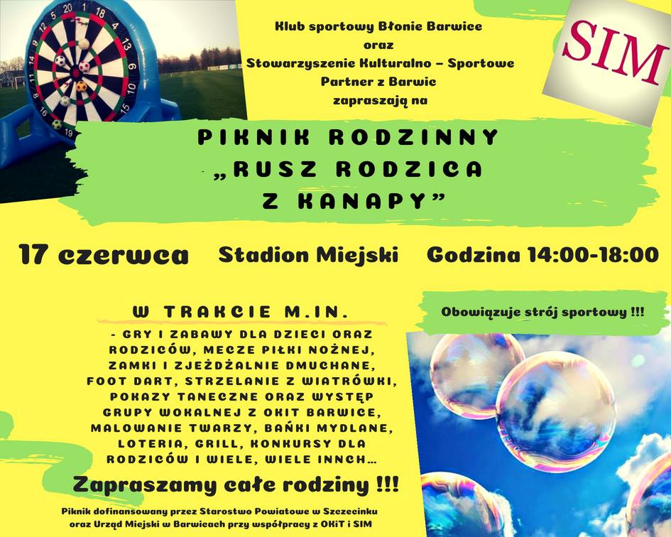 Serdecznie zapraszamy na Piknik rodzinny pn. "Rusz rodzica z kanapy", który odbędzie się w najbliższą niedzielę 17 czerwca 2018 r. od godz. 14.00 na Stadionie Miejskim w Barwicach.