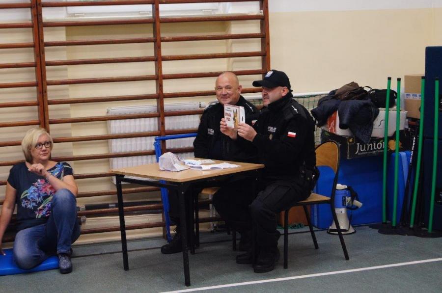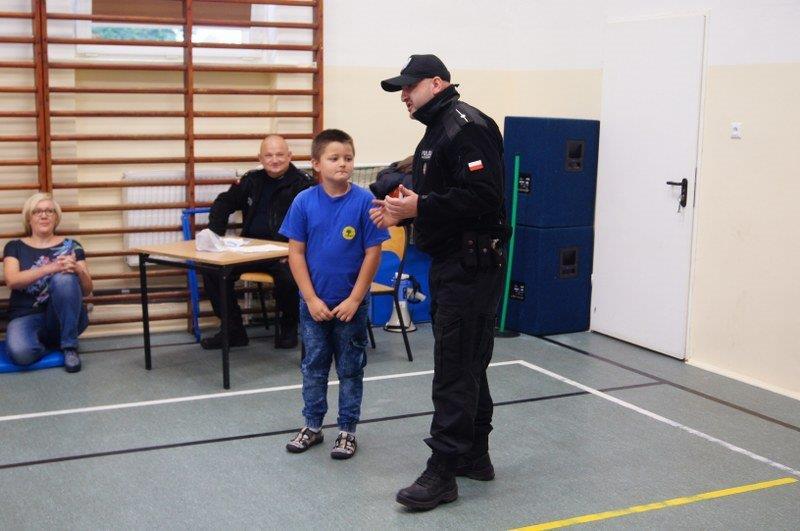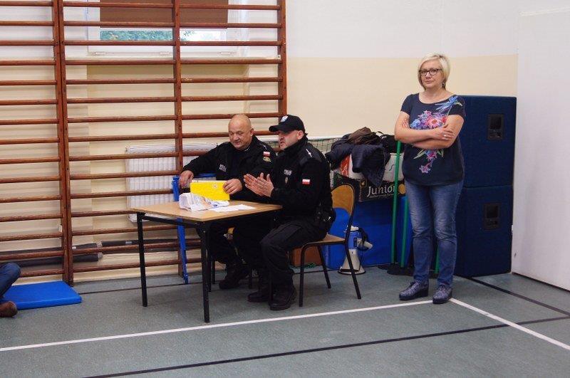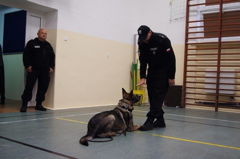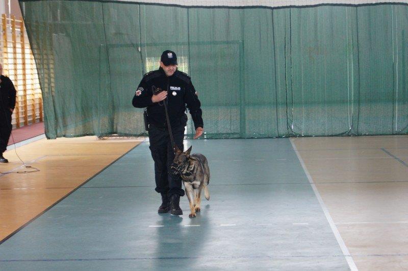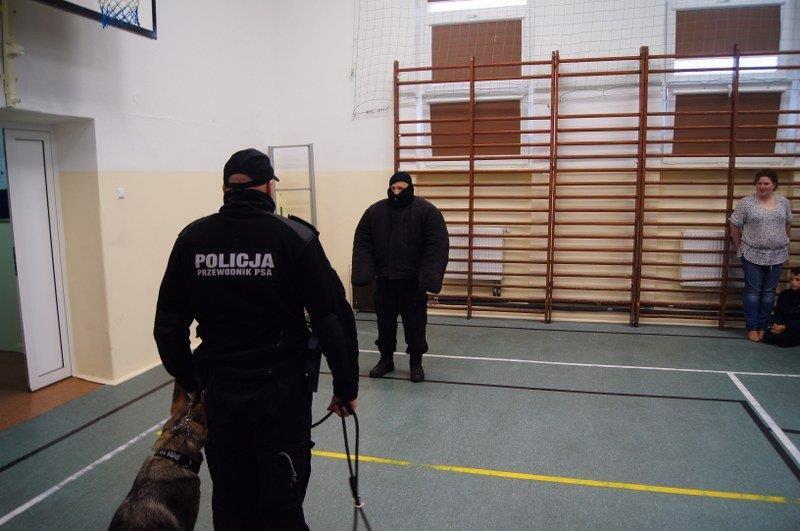 W czwartek 28 września gościliśmy w naszej szkole mł. asp. Piotra Kłosa z psem Kalą z Komendy Powiatowej Policji w Szczecinku i mł. asp. Mariusza Krysiaka z Komendy Policji w Połczynie. Policjanci przypomnieli zasady bezpieczeństwa w kontakcie ze zwierzętami oraz zaprezentowali uczniom sposoby zachowania się w przypadku spotkania z agresywnym psem. Uczniowie z ogromnym zainteresowaniem wysłuchali pogadanki, a nawet aktywnie uczestniczyli w ćwiczeniach.