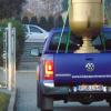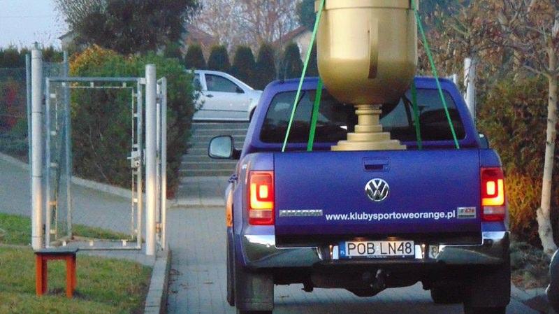 Na samochodzie znajdował się przymocowany pasami ogromny puchar.