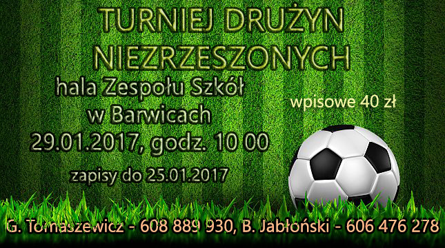 Serdecznie zapraszamy do udziału w turnieju drużyn niezrzeszonych, który odbędzie się w niedzielę 29 stycznia 2017 od godz. 10-tej w hali Zespołu Szkół w Barwicach.