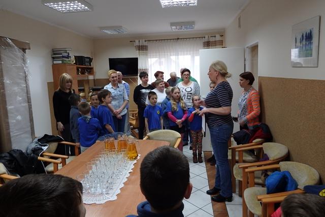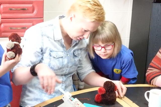 Tym razem zajęcia wesołej biblioteki odbyły się w Środowiskowym Domu Samopomocy„SŁONECZKO”. Dzieci zostały wspaniale przyjęte przez gospodarzy, były pyszne ciasteczka własnego wypieku, prezenty dla każdego uczestnika oraz gipsowe figurki niedźwiedzia symbolu Barwic. Praca w grupach z osobami niepełnosprawnymi była bardzo twórcza i poznawcza wywarła duże wrażenie na nas wszystkich, wspólnie tworzyliśmy misie z pomponów, suszone jabłka