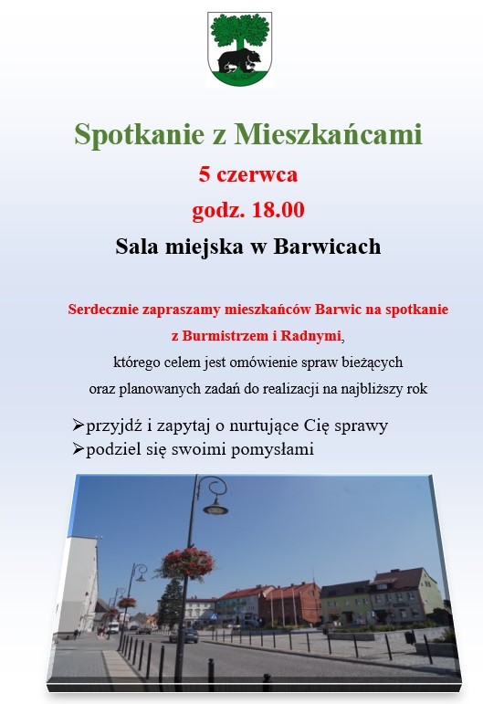 Informujemy, że w dniu 5.06.2019 r. o godz. 18.00 w sali miejskiej w Barwicach odbędzie się spotkanie Burmistrza Barwic i Rady Miejskiej z mieszkańcami.
