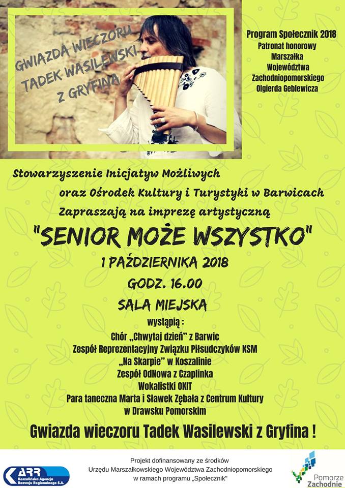 W imieniu organizatorów: Stowarzyszenia Inicjatyw Możliwych oraz Ośrodka Kultury i Turystyki serdecznie zapraszamy na impreze artystyczną w ramach projektu "Senior może wszystko" dofinansowanego ze środków Urzędu Marszałkowskiego Województwa Zachodniopomorskiego w ramach programu "Społecznik".