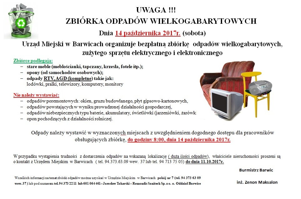 WYZNACZONE MIEJSCA ZBIÓRKI ODPADÓW WIELKOGABARYTOWYCH - 14 październik 2017 r. godz. 8:00